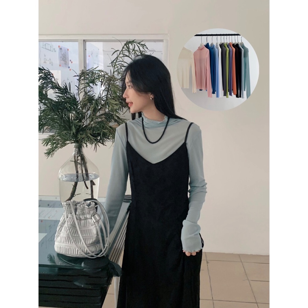 台中現貨⚡️韓系春夏必搭 彈性 超多色木耳邊堆堆領網紗長袖薄款上衣修身顯瘦打底衫
