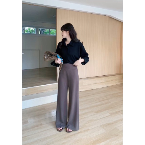 高腰收腹垂墜感彈力傘擺喇叭寬褲,高腰收腹褲頭修飾小肚肚,垂墜度很好看