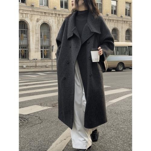 202512小資💘 (含100%澳洲羊毛)設計師款立領雙面羊毛大衣寬鬆雙排扣毛呢大衣外套