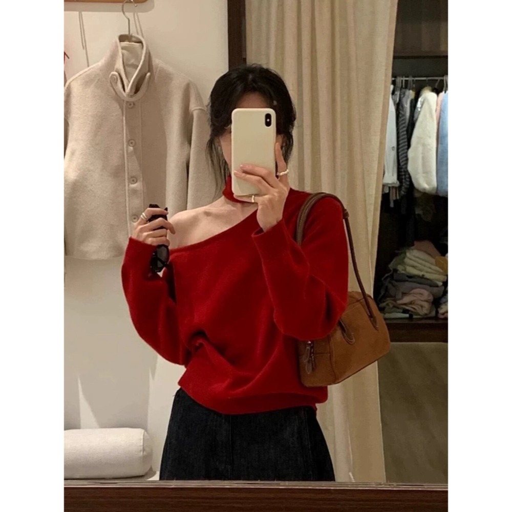 202511小資💘小露香肩小心機 choker造型掛脖斜肩羊毛針織毛衣 3色