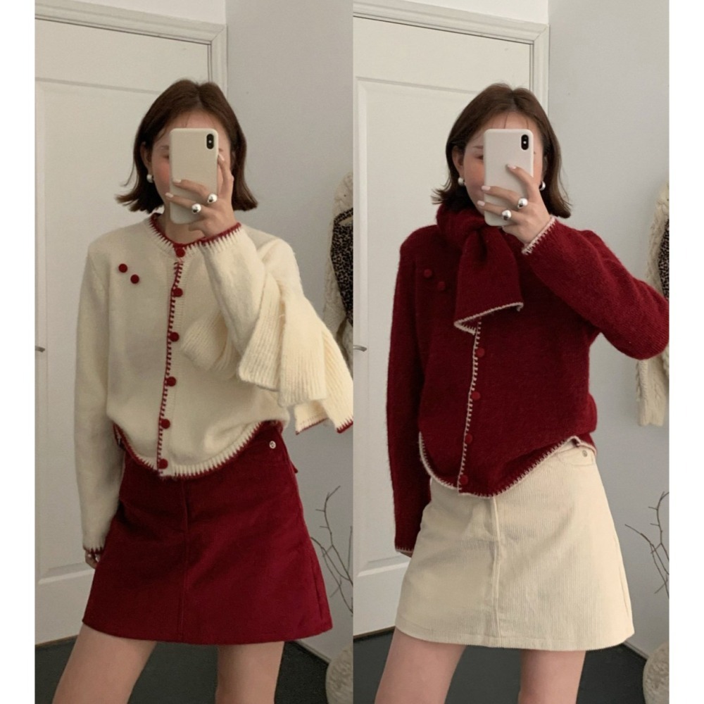韓系撞色外搭上衣毛衣 純色百搭減齡針織開衫(配圍巾) 🧧過年紅色毛衣 w8691 3色