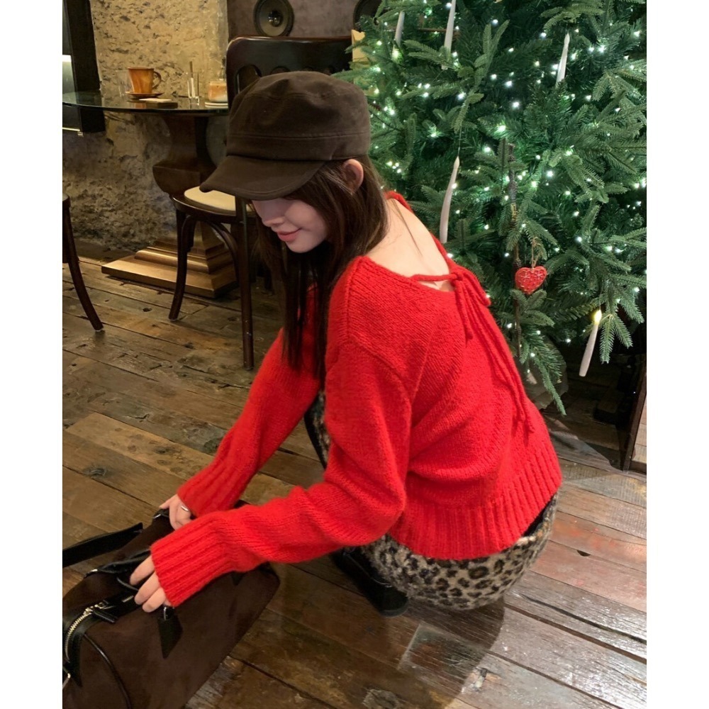 韓系初雪如約而至兩面穿冬日溫柔綁帶蝴蝶結軟糯舒適甜美套頭保暖毛衣(含12%羊毛)過年紅色毛衣25178# LKZ