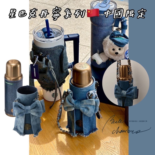 即將抵台🔥星巴克正品 丹寧蝴蝶結杯套鏈條+460ml不鏽鋼復古銅金保溫杯✨丹寧星咖系列 中國限定 2026 3月新品
