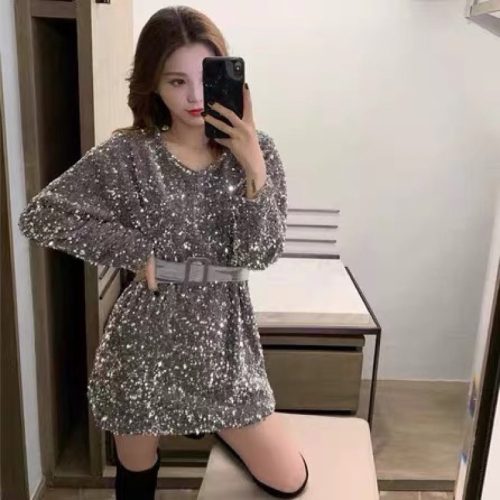 ❤️現貨在台,銀.黑 時尚 V領 亮片 派對 絲絨 宴會 長袖 年會 收腰 腰帶 顯瘦 小個子 連衣裙 洋裝 禮服