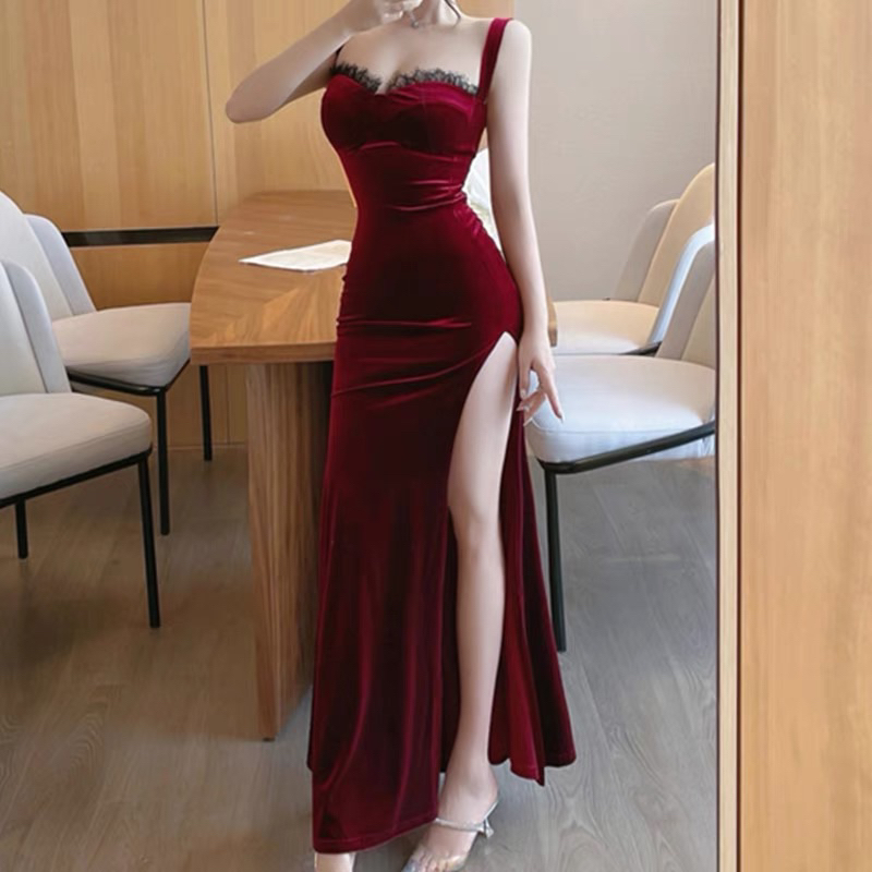 ❤️現貨在台,紅M(S- XL) 中大尺碼 氣質 名媛 性感 吊帶 背帶 收腰 顯瘦 設計感 絲絨 連衣裙 長裙 禮服