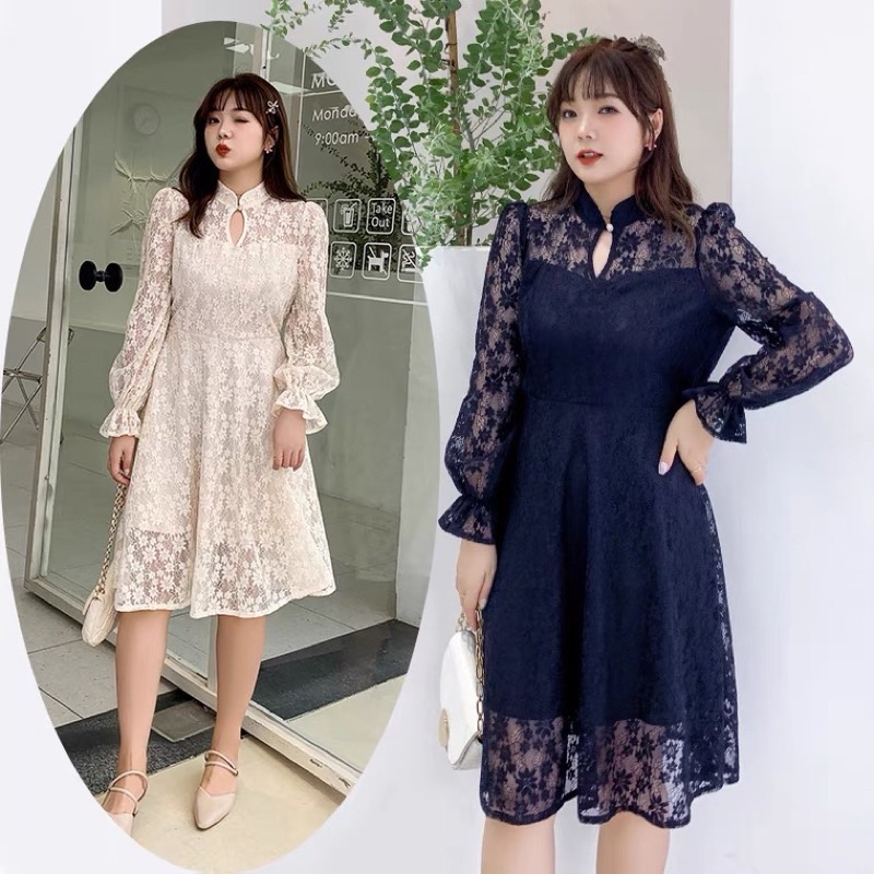 ❤️現貨在台,淺黃2XL(S- 6XL) 中大尺碼 大碼 蕾絲 連衣裙 長袖 旗袍 氣質 顯瘦 藍色 洋裝 禮服 伴娘