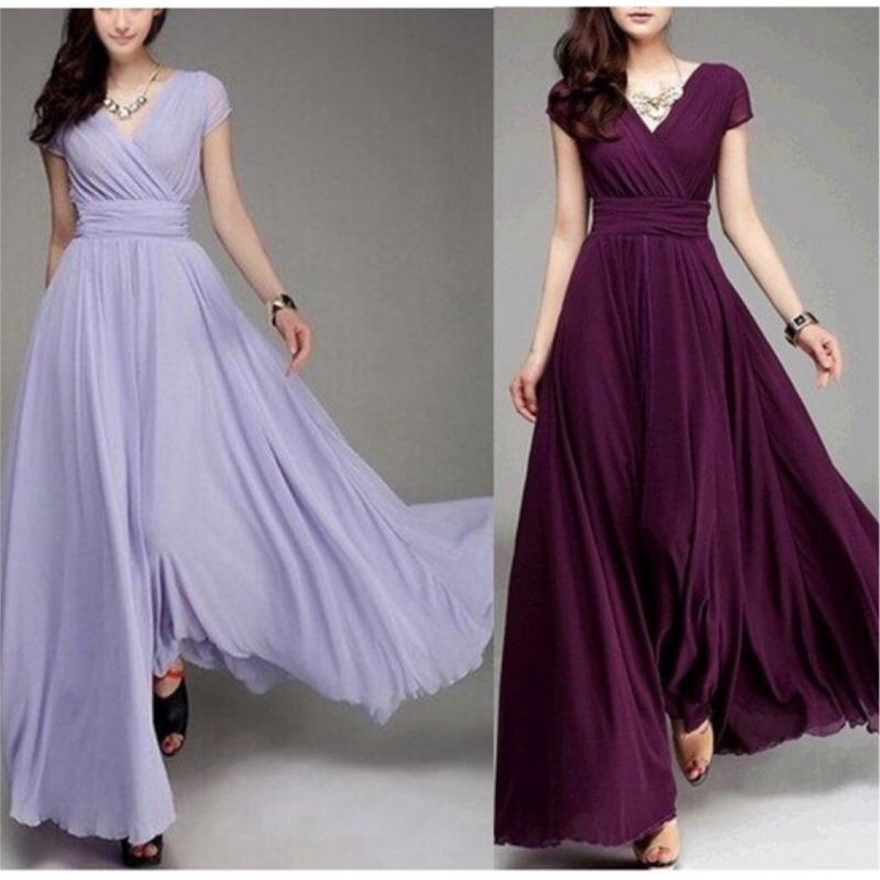 #淺紫 #XL #中大尺碼 #V領 #短袖 #波西米亞風 #收腰 #連衣裙 #雪紡 #飄逸 #大擺 #長裙 #禮服 #伴娘 #5xl #4xl #3xl #2xl