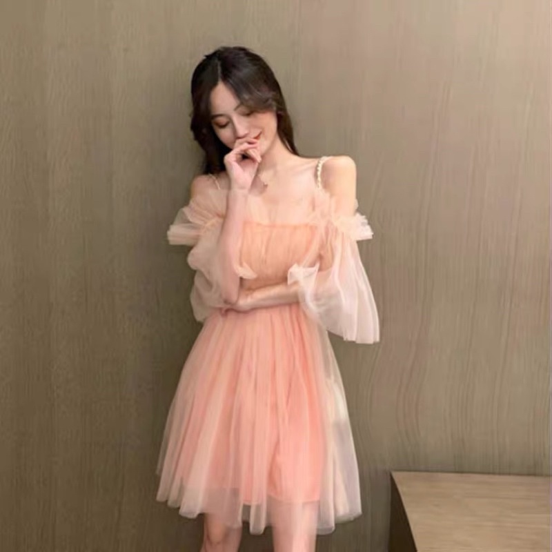 ❤️預購 粉 喇叭袖 飄逸 禮服 婚宴 一字領 連衣裙 法式 復古 短裙 網紗 收腰 顯瘦 氣質 吊帶 洋裝 禮服 伴娘