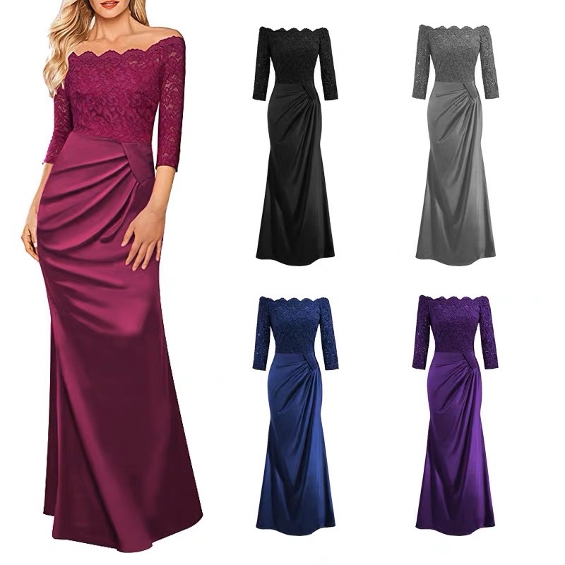 ❤️現貨在台,灰2XL(S- 2XL) 中大尺碼 緞面 拼接 一字領 露肩 正式 主持人 新娘 伴娘 連衣裙 長裙 禮服