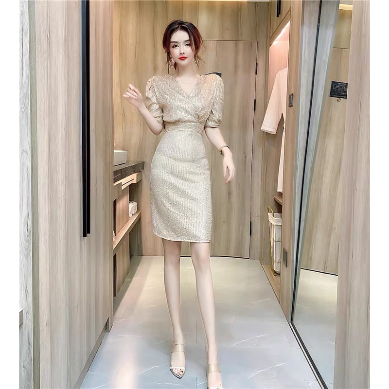 ❤️現貨在台,玫瑰金XL(S-XL) 中大尺碼 不規則 高端 輕奢 亮片 連衣裙 氣質 女神 收腰 顯瘦 禮服 洋裝