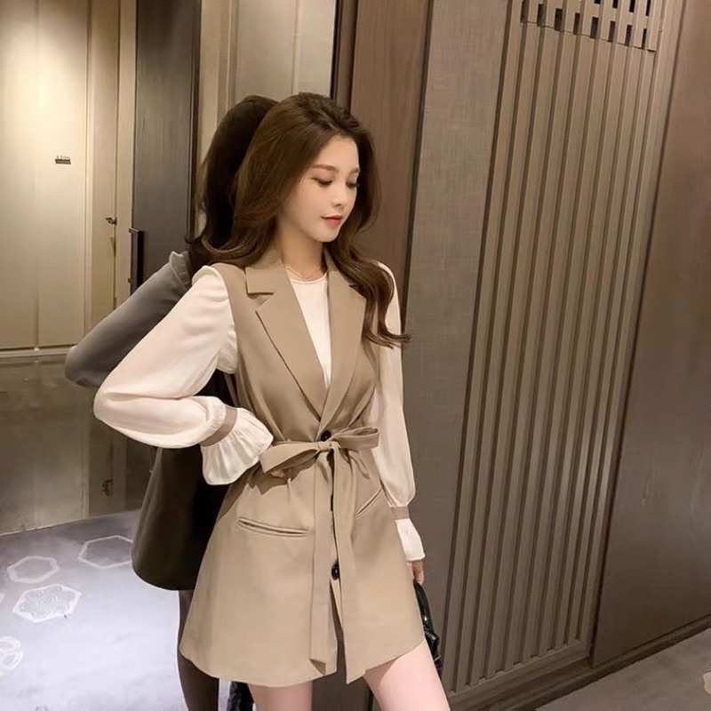 ❤️現貨在台,卡其L,2件組(S- XL) 中大尺碼 小個子 氣質 輕熟 馬甲 開襟 背心 + 長袖 襯衫 上衣 套裝