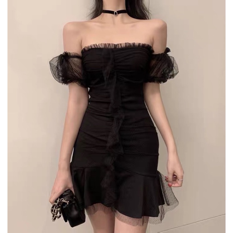❤️現貨在台,黑 修身 性感 女神 夜店 禮服 一字領 平口 拼接 露肩 網紗 連衣裙 氣質 收腰 顯瘦 露肩 小黑裙