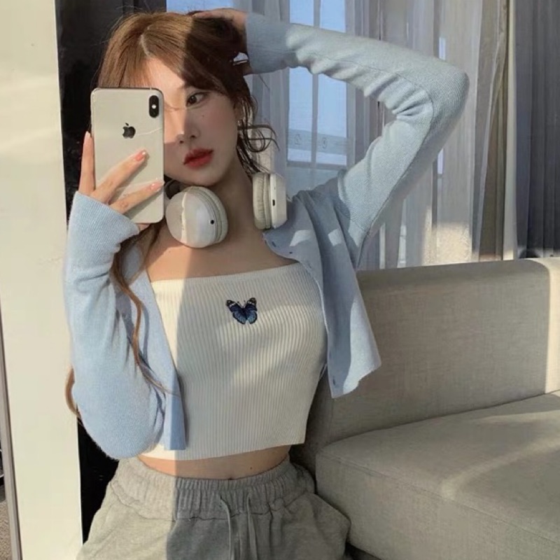 ❤️現貨在台,背心 性感 女神 防曬 藍色 針織 開襟 長袖 外套 或 短版 上衣 外搭 背心 小背心 蝴蝶 刺繡