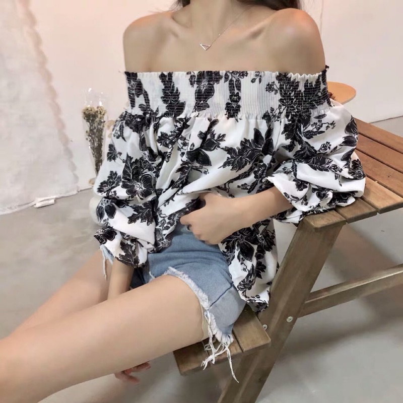 ❤️預購(適合S- 2XL) 韓版 中大尺碼 一字領 露肩 五分袖 雪紡 寬鬆 水墨 印花 顯瘦 度假 出國 上衣