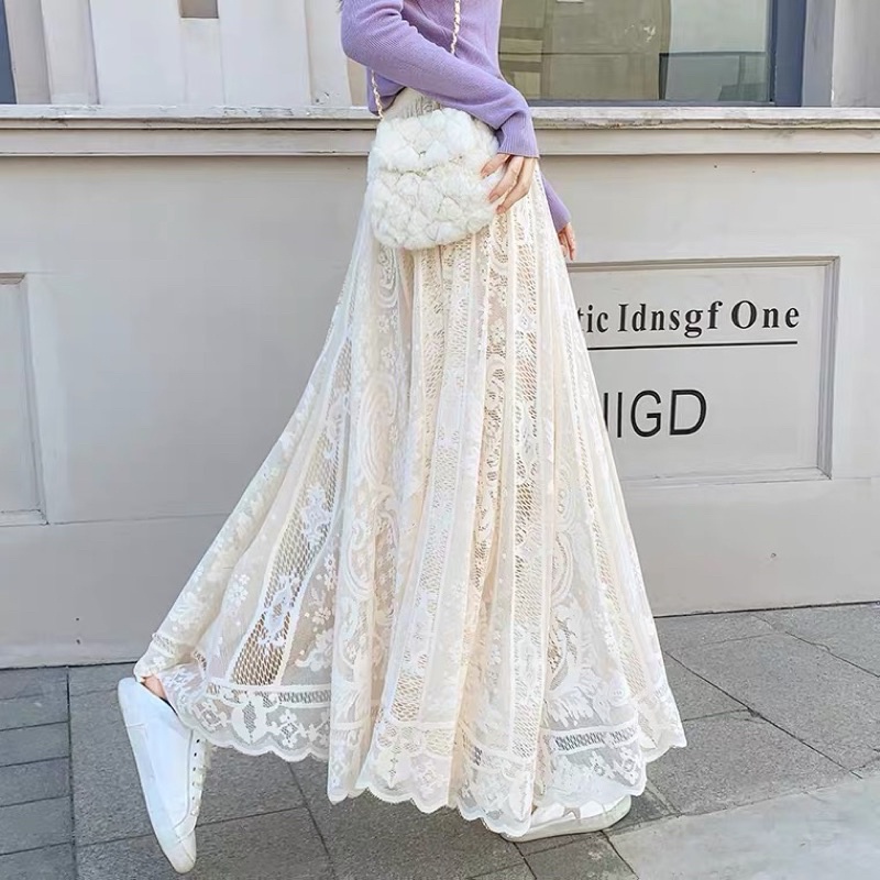 ❤️現貨在台,杏 甜美 閨蜜 蕾絲 半身裙 高腰 顯瘦 仙女 長裙 半身裙 飄逸 大擺