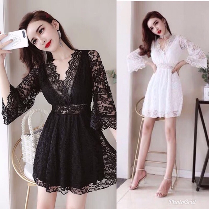 #現貨在台 #XL #連衣裙 #韓版 #時尚 #氣質 #深v #V領 #蕾絲 ##七分袖 #收腰 #顯瘦 #公主 #女神 #婚宴 #禮服 #夜店 #女神