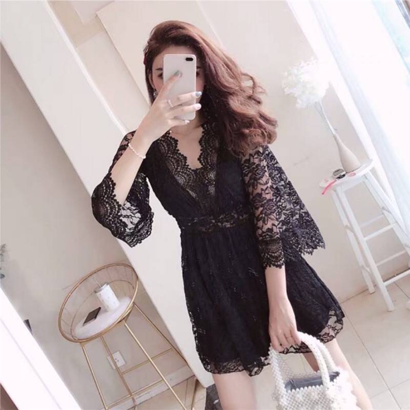 #現貨在台 #XL #連衣裙 #韓版 #時尚 #氣質 #深v #V領 #蕾絲 ##七分袖 #收腰 #顯瘦 #公主 #女神 #婚宴 #禮服 #夜店 #女神