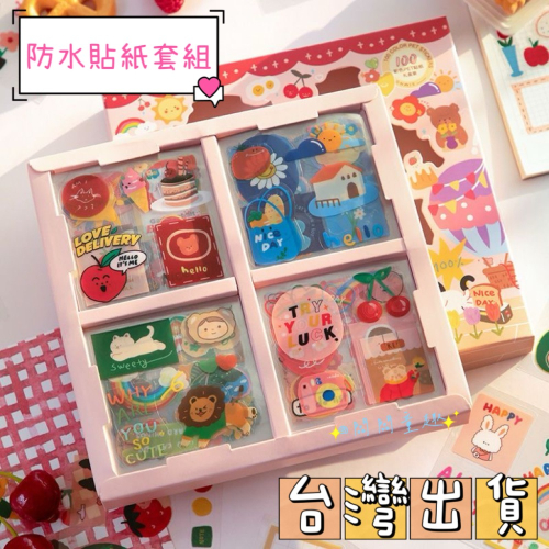 這款「防水貼紙套組」共有 100 張設計款式,涵蓋風景、字母、雲朵、卡通元素。