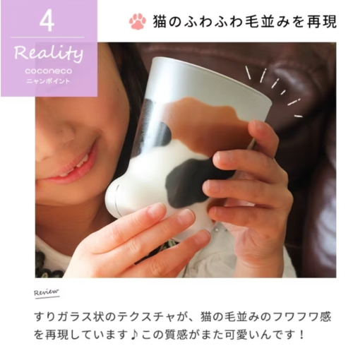 ~在玻璃杯中再現貓咪的魅力點~ Coconeco與普通透明玻璃不同 ,具有磨砂玻璃表面 它的質地略顯粗糙而柔軟 J 給人一種貓毛般的蓬鬆感 o 玻璃杯底部有一隻迷人的粉紅色爪子 -.