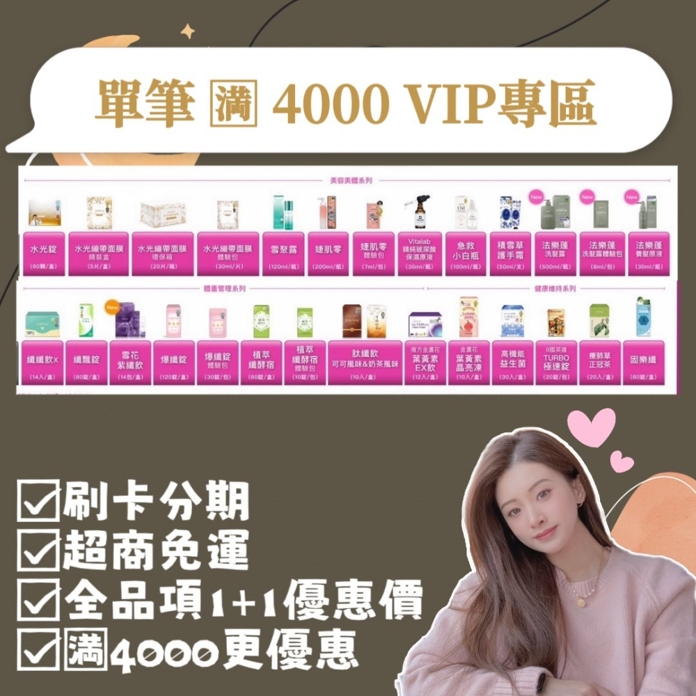 混品(不含試用包)滿額4000即享vip折扣優惠