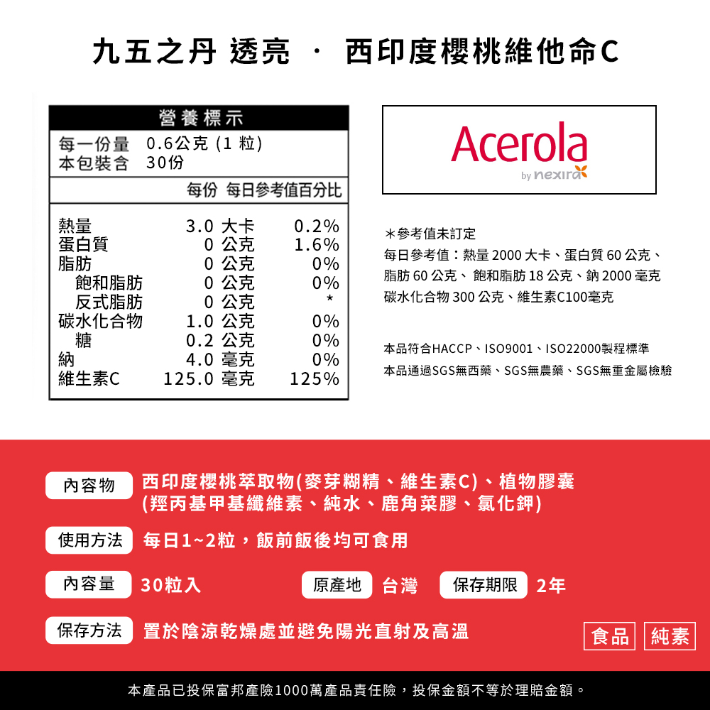 內容物:西印度櫻桃萃取物(麥芽糊精、維生素C)、植物膠囊(羥丙基甲基纖維素、純水、氯化鉀)