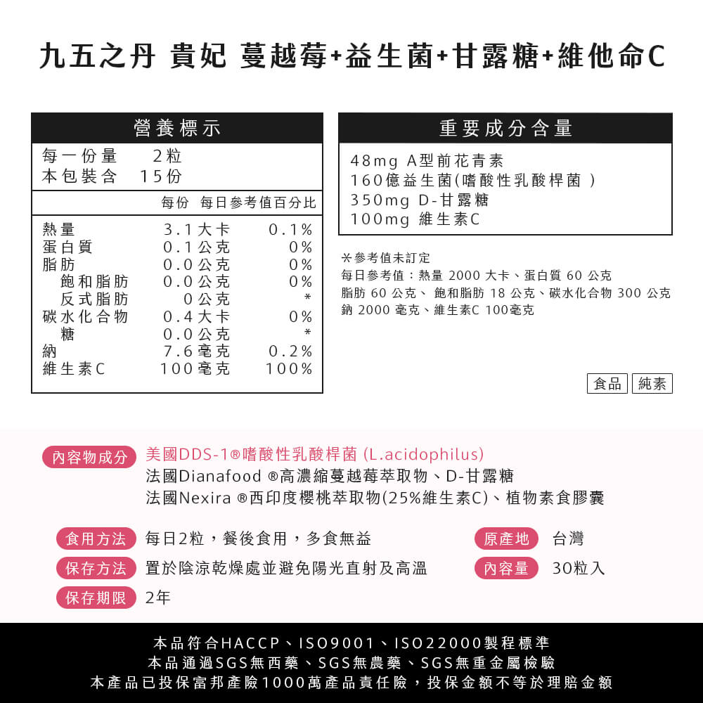 成 份:DDS-1®嗜酸性乳酸桿菌 (L.acidophilus)、Dianafood®高濃縮蔓越莓萃取物、D-甘露糖、Nexira®西印度櫻桃萃取物(25%維生素C)