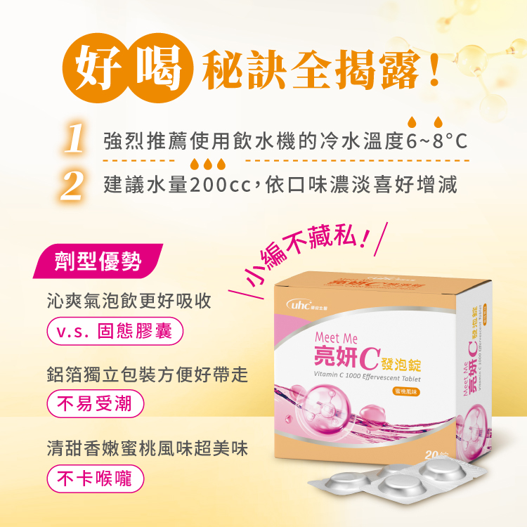 食用方式:每日1錠,以150 〜 200 C.C.冷水或溫水沖泡溶解後飲用,發泡錠請勿直接吞食。