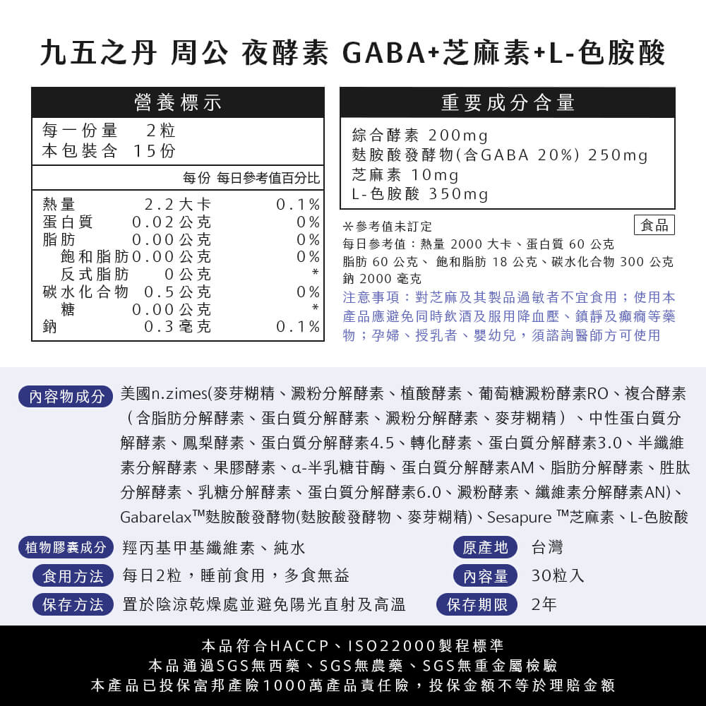 成 份:美國n.zimes(麥芽糊精、澱粉分解酵素、植酸酵素、葡萄糖澱粉酵素RO、複合酵素(含脂肪分解酵素、蛋白質分解酵素、澱粉分解酵素、麥芽糊精)、中性蛋白質分解酵素、鳳梨酵素、蛋白質分解酵素4.5、轉化酵素、蛋白質分解酵素3.0、半纖維素分解酵素、果膠酵素、α-半乳糖苷酶、蛋白質分解酵素AM、脂肪分解酵素、胜肽分解酵素、乳糖分解酵素、蛋白質分解酵素6.0、澱粉酵素、纖維素分解酵素AN)、 Gabarelax™麩胺酸發酵物(麩胺酸發酵物、麥芽糊精)、Sesapure ™芝麻素、L-色胺酸