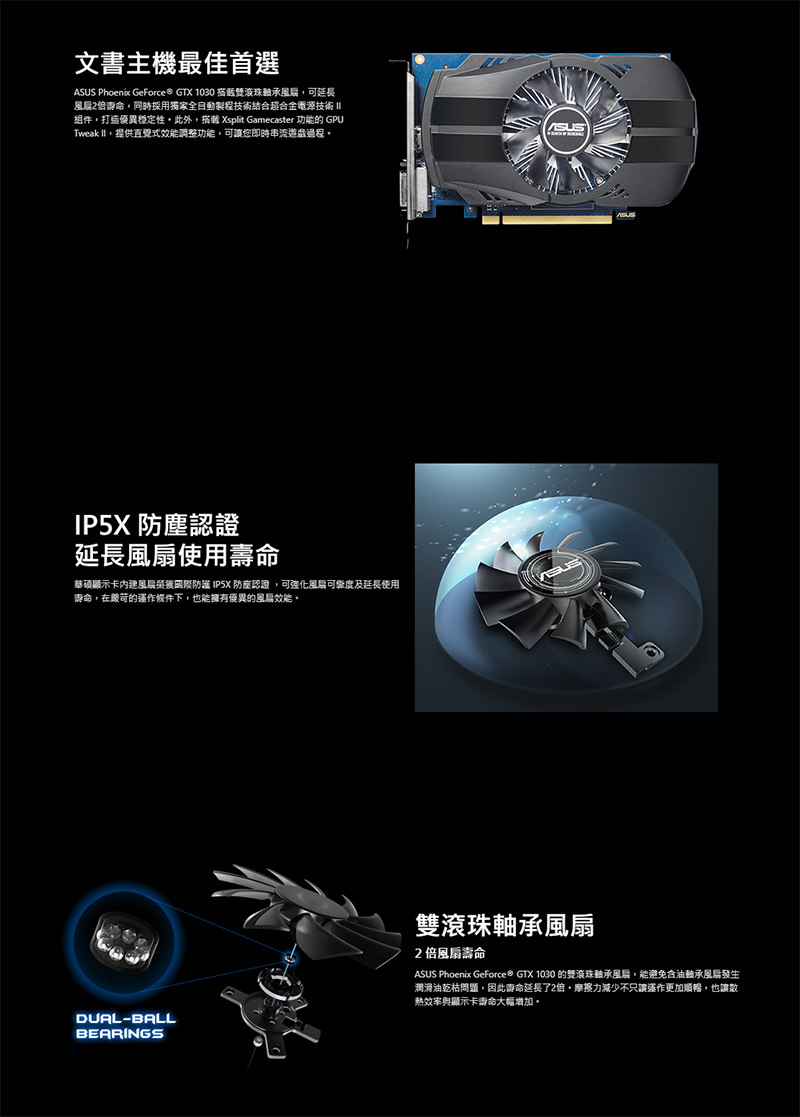 雙滾珠軸承風扇:低摩擦力使運作更順暢,還可延長2倍使用壽命並提升散熱效能。