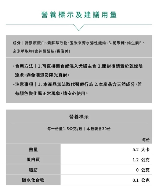 特別添加紫蘇萃取及Beta葡聚糖,幫毛孩從體內調節免疫力,增加抵擋對外界刺激的自然防護力,減少皮膚健康的失衡問題!