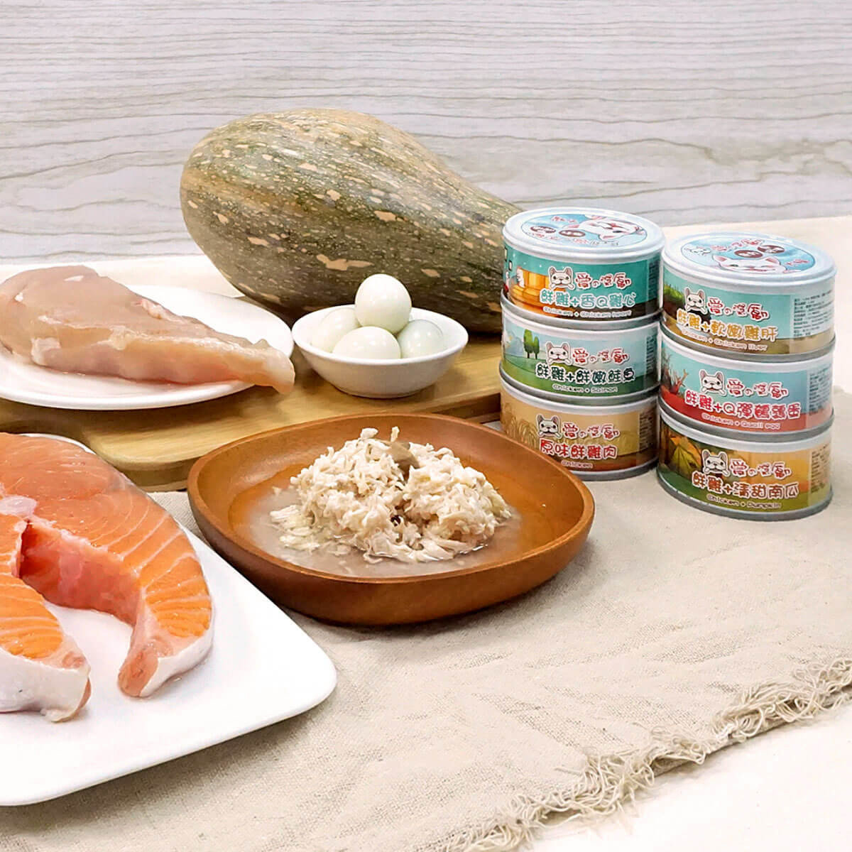 以新鮮雞肉為基底加上五種不同配料-Q彈鵪鶉蛋、軟嫩雞肝、清甜南瓜、鮮嫩鮭魚、香Q雞心。