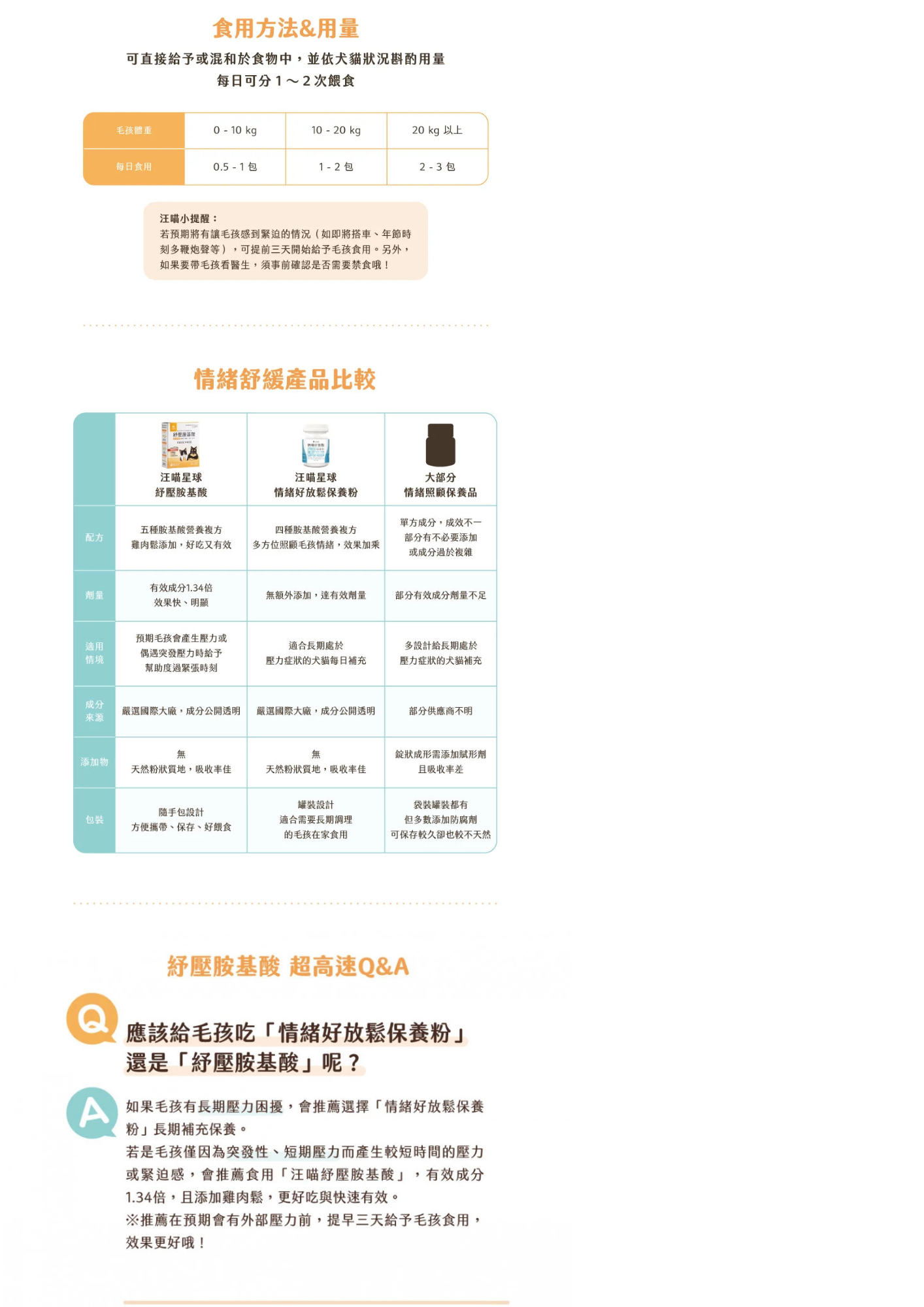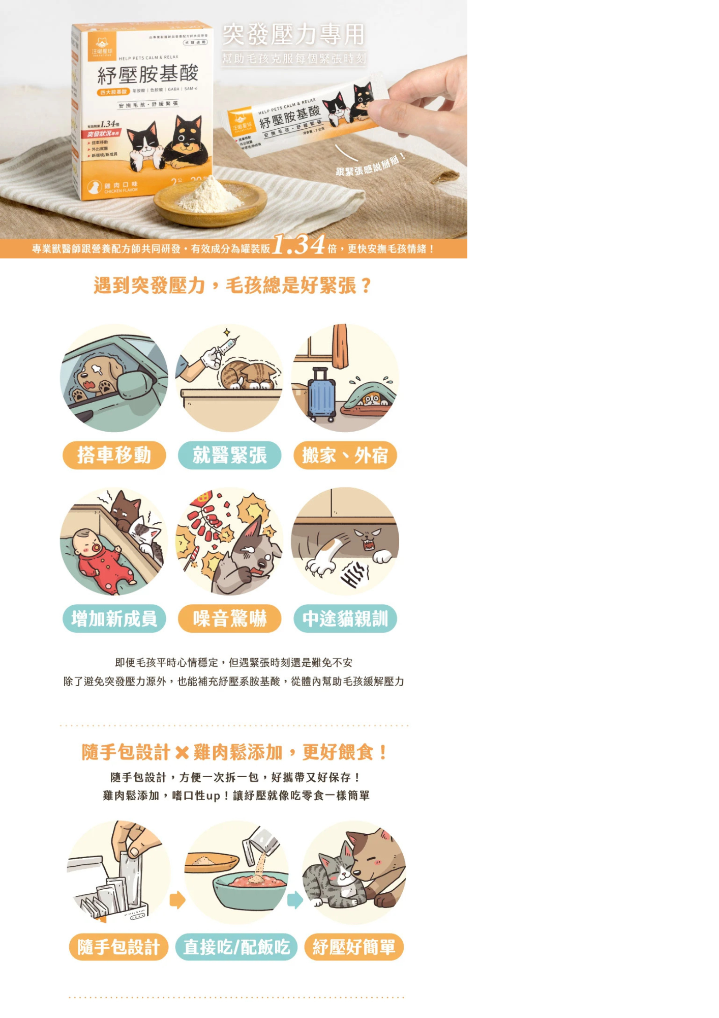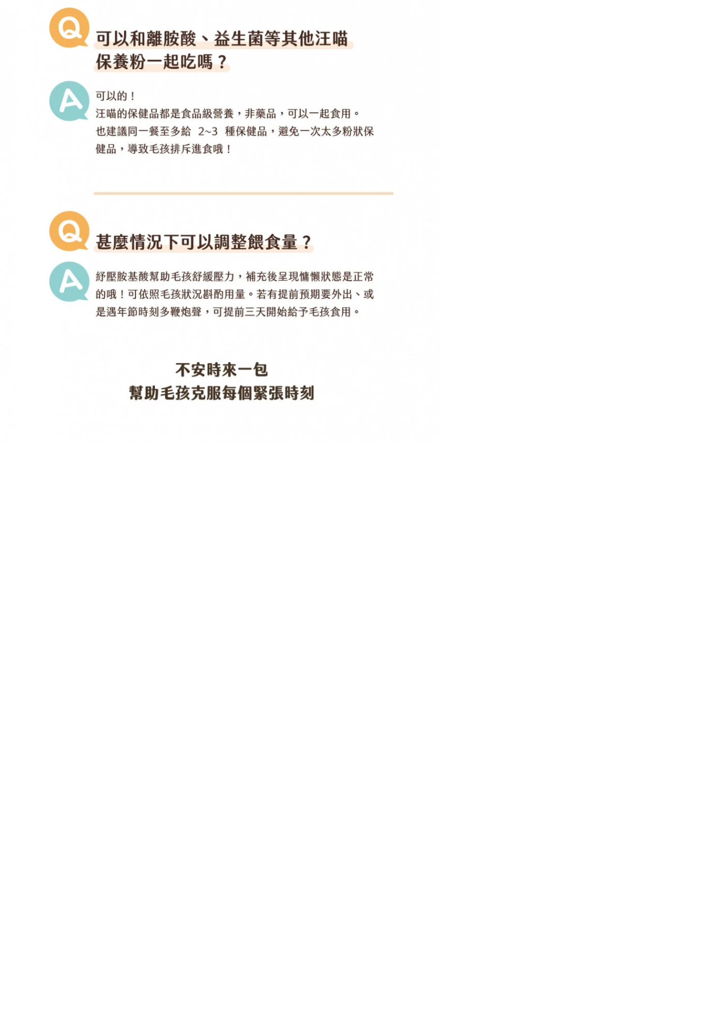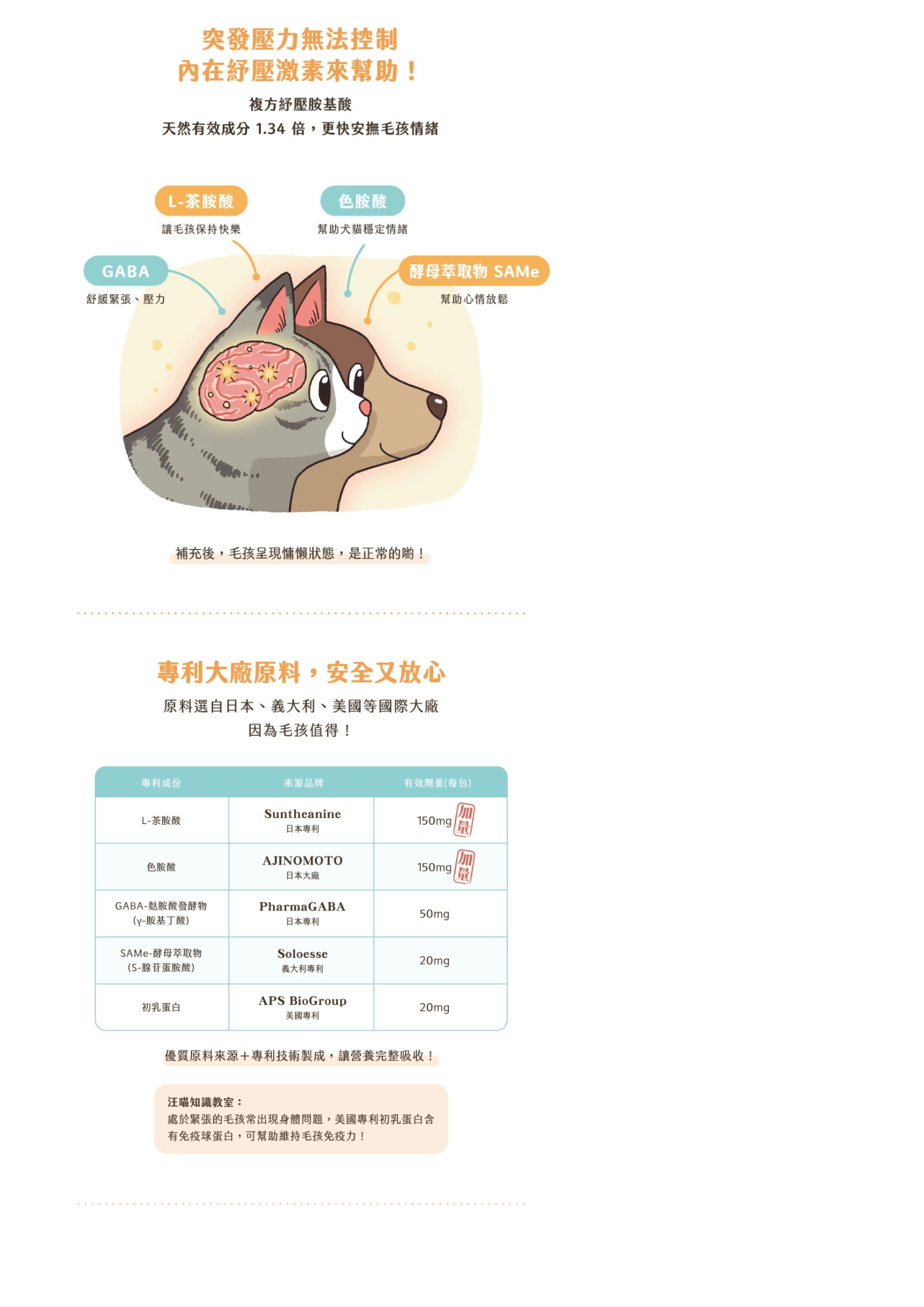 • 嚴選國際專利成分,加強有效劑量,安撫毛孩更快更明顯
