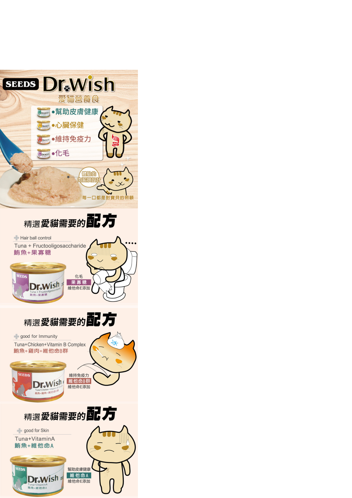 體貼的肉泥狀設計,幫助消化,添加機能配方。關心愛貓健康,每一口都是對寶貝的照顧。