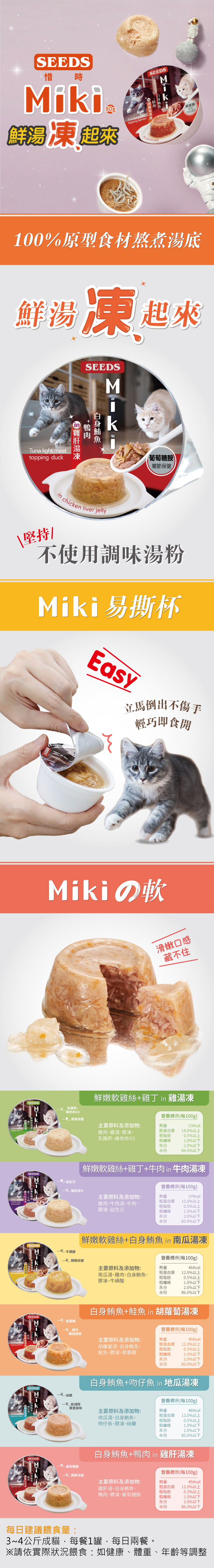 Miki滑嫩口感藏不住,採易撕杯封裝設計,立馬倒出不傷手,輕巧即食開,特別添加機能配方,值得愛貓細細品嚐。