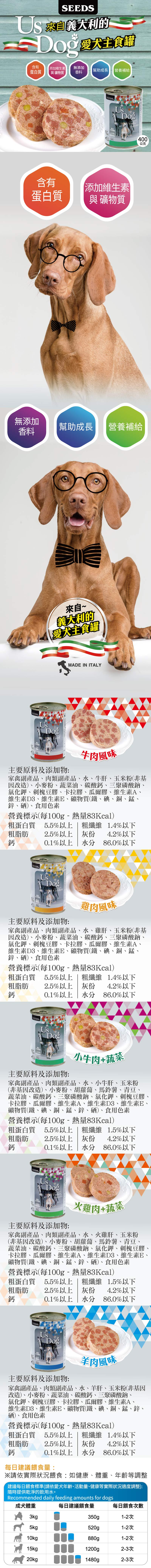 來自義大利的主食罐,含愛犬需要的維生素、礦物質,無添加防腐劑及香料,經典肉醬罐是愛犬首選的主食罐。