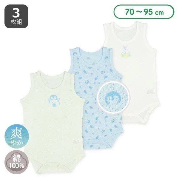 日本西松屋|北極熊企鵝小夥伴網眼無袖包屁衣-三件組 童裝 日本代購