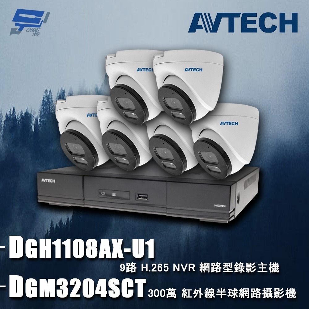 【此組合為 AVTECH陞泰組合 DGH1108AX-U1 9路 主機+DGM3204SCT 300萬 紅外線 半球網路攝影機 6支】