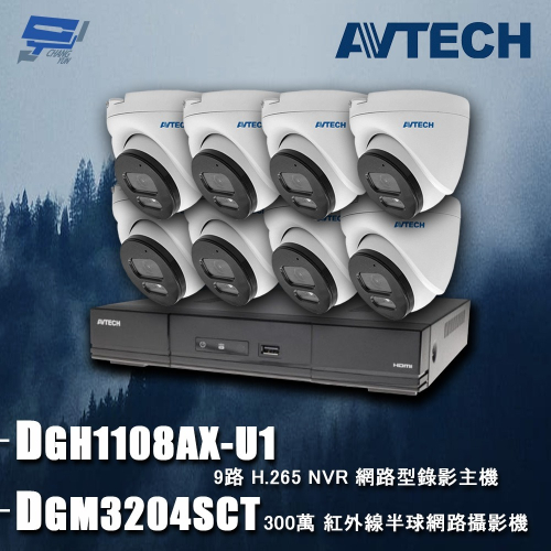 【此組合為 AVTECH陞泰組合 DGH1108AX-U1 9路 主機+DGM3204SCT 300萬 紅外線 半球網路攝影機 8支】