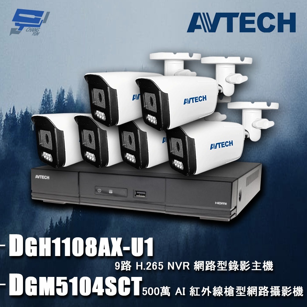 【此組合為 AVTECH陞泰組合 DGH1108AX-U1 9路 主機+DGM5104SCT 500萬 AI 紅外線槍型 網路攝影機 6支】