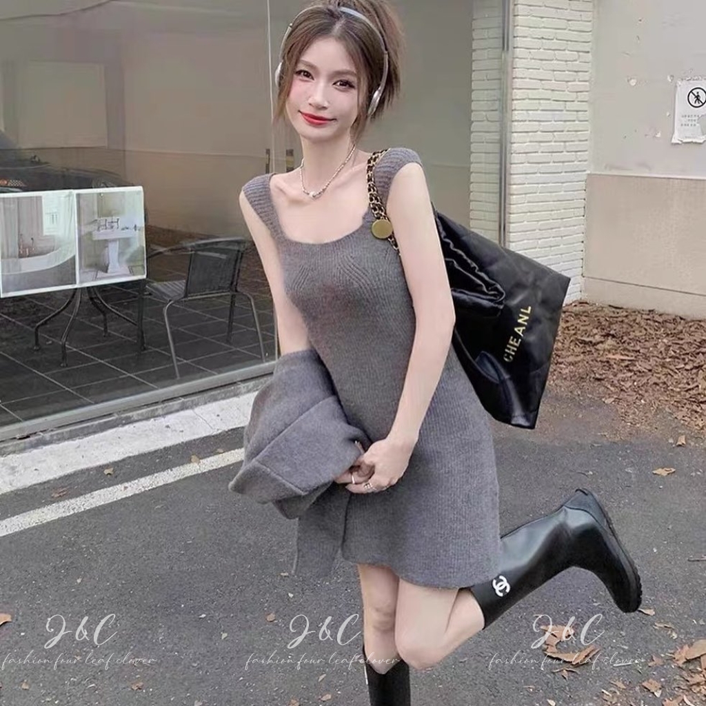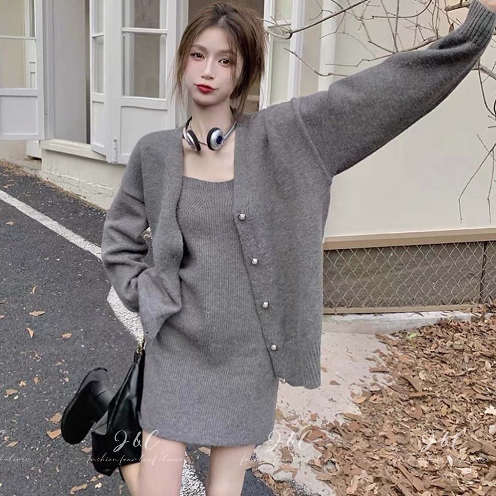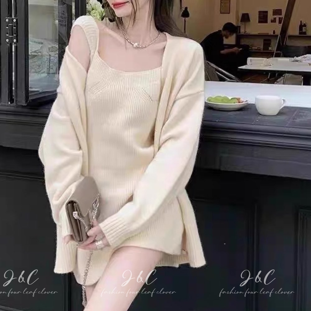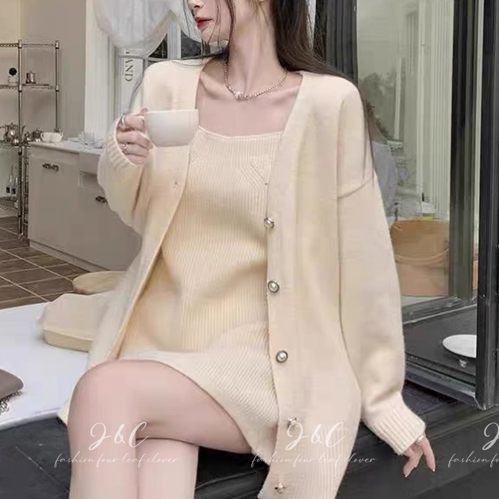 針織外套加上小吊帶裙