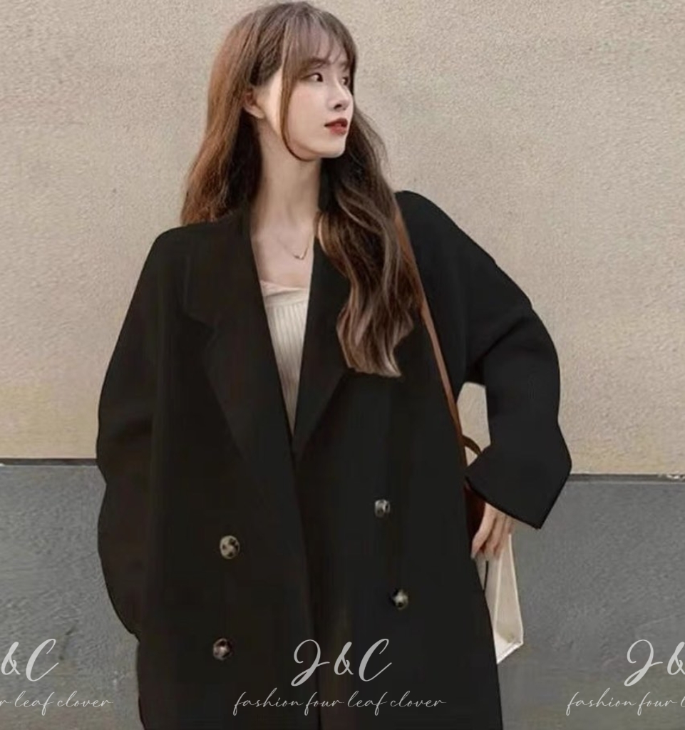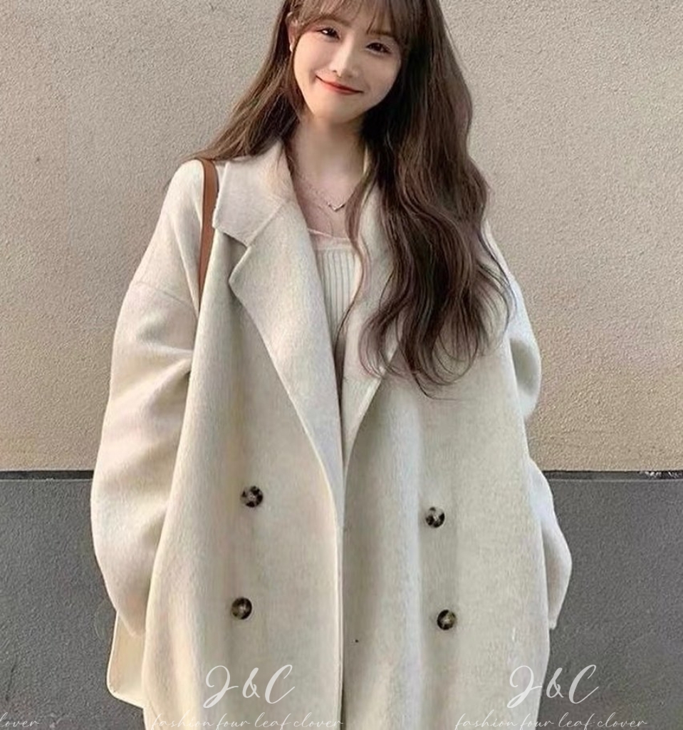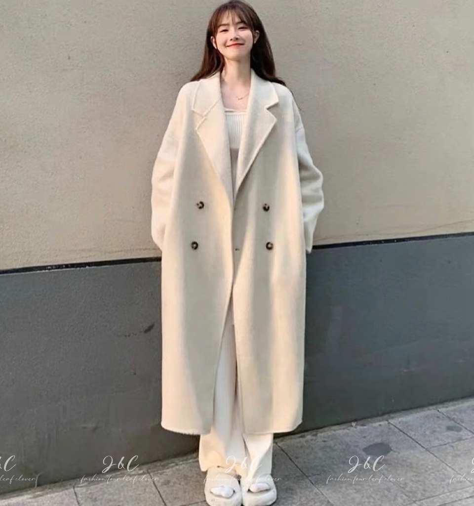 😍韓版-時尚毛呢加厚中長款過膝雙排扣慵懶風大衣😍