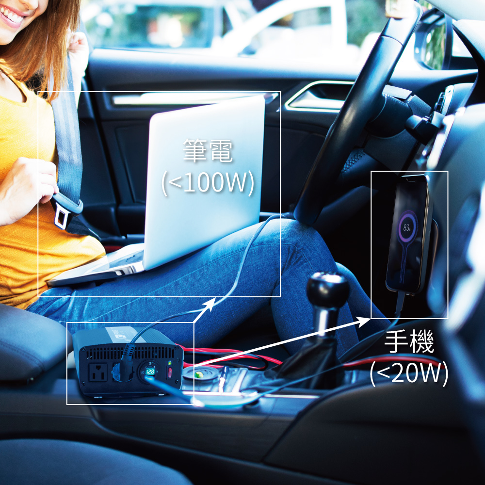 4.連接汽車(DC)12V電源系統,馬上轉換成家用(AC)110V的電源輸出,讓愛車也可以提供AC110V各類電源設備,在車上享受便利的家用電器(上限120W)。