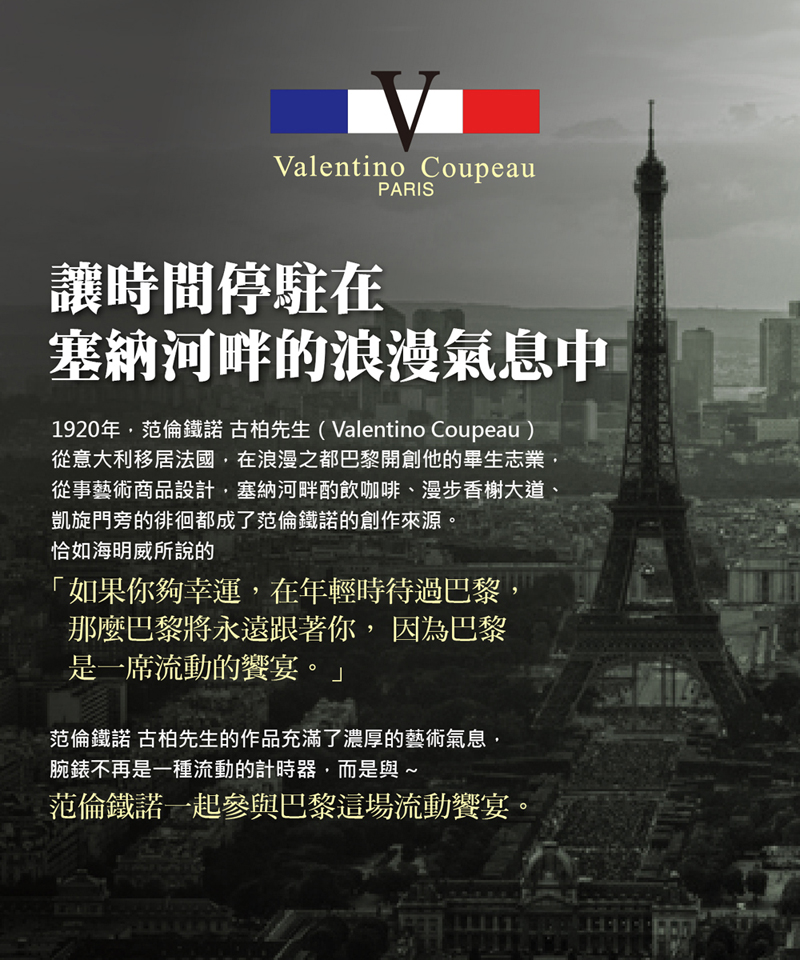 1920年代,范倫鐵諾 .古柏先生(Valentino Coupeau)從義大利移居到法國浪漫的藝術之都「巴黎」,從事於主題設計及藝術商品等工作。由於從小受到義大利藝術風格的陶冶,再加上巴黎大學主修的工業設計學科及設計師父親浪漫作風的影響,使得范倫鐵諾先生的作品充滿古典既新潮的歐洲風格。時至今日Valentino Coupeau已成為一個橫跨服飾業及鐘錶精品家喻戶曉的姓氏品牌,在您生活周遭都能享受此品牌高格調的時尚品味。
