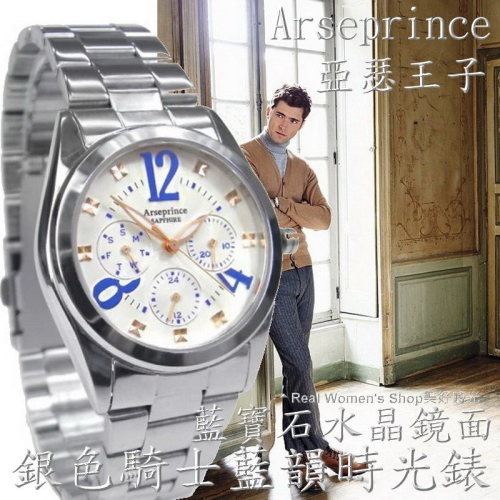 Arseprince 亞瑟王子 銀色騎士藍韻時光錶 藍寶石水晶鏡面 不鏽鋼鍊 真三眼 中性錶 男錶.女錶皆適用