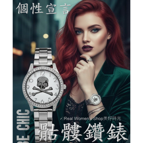 個性宣言! 防水防刮 閃耀骷髏鑽錶 精準計時 日本機芯 不鏽鋼帶 大錶面 女生酷炫手錶 中性錶