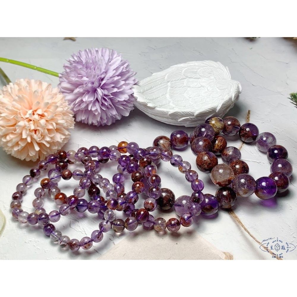 紫幽靈手珠,是由紫水晶內包泥狀類等共生礦物,即稱紫幽靈水晶,也可稱為紫異象水晶。