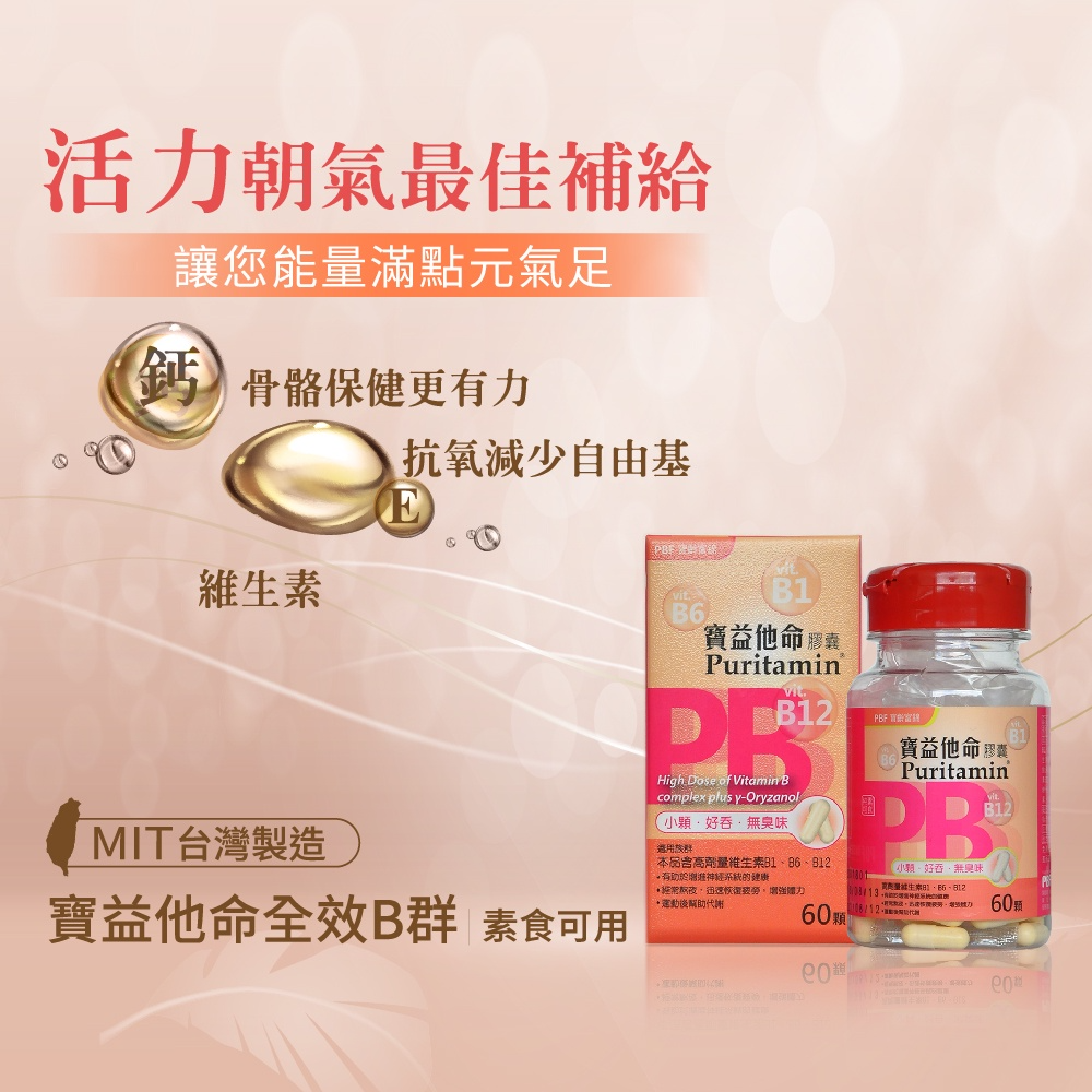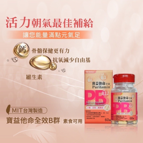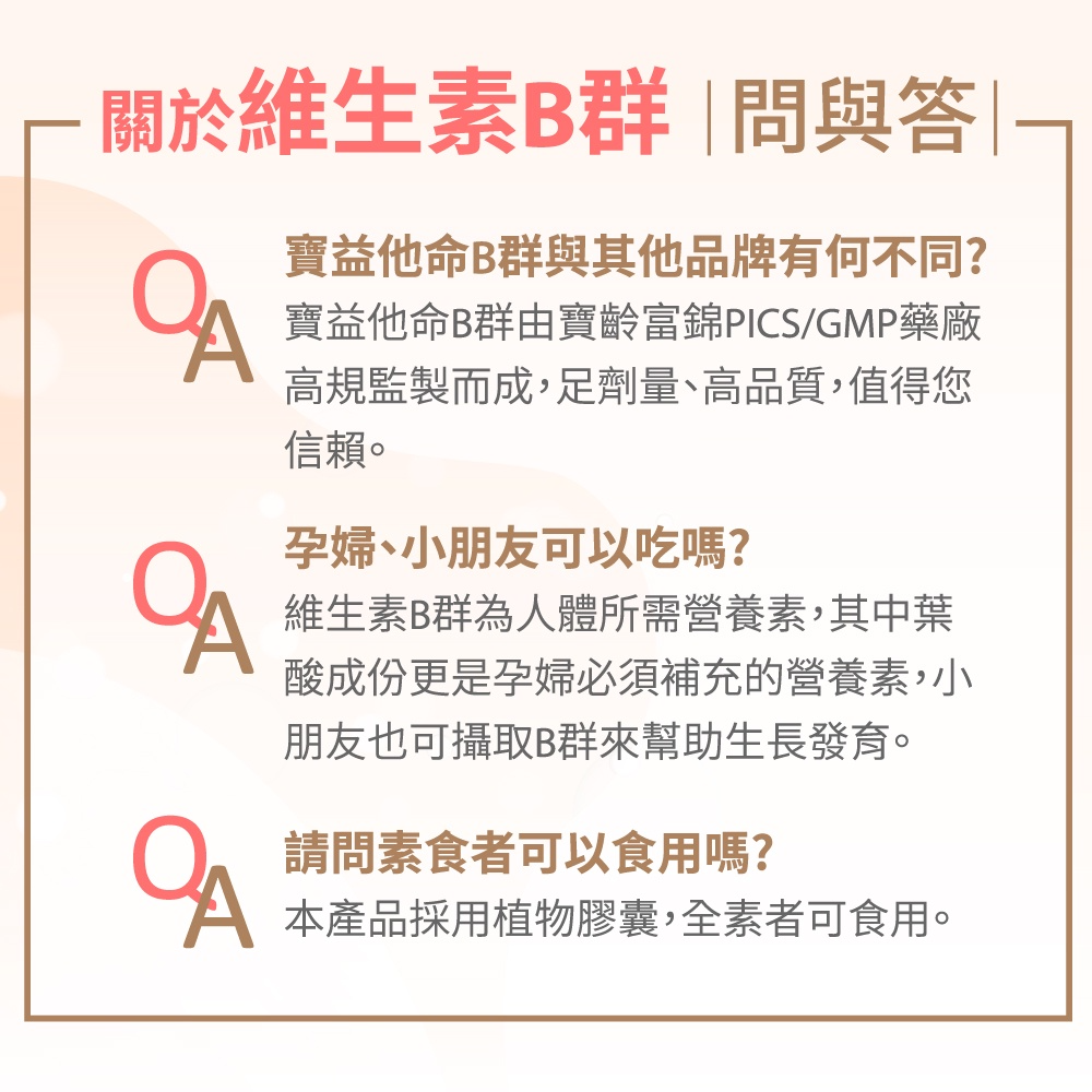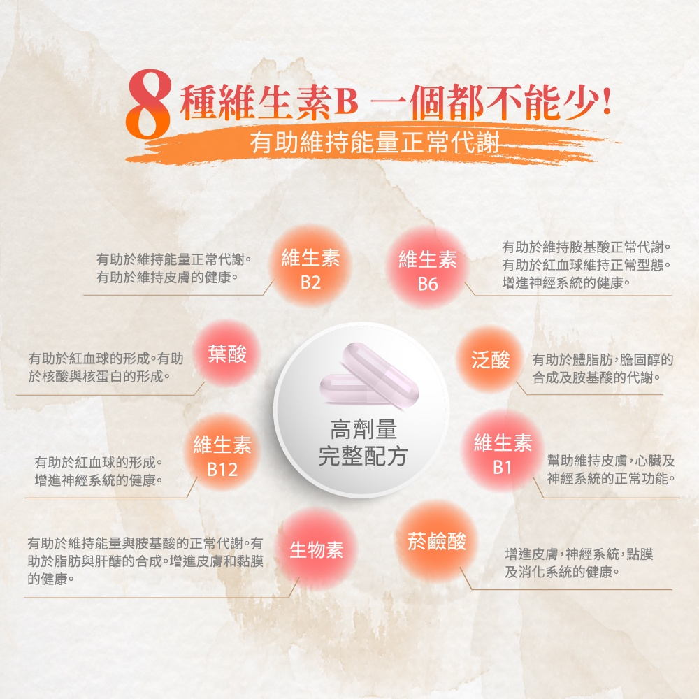 商品成分:維結晶狀α-纖維素、維生素B1、維生素B6、維生素E(乙酸dl-α-α生育醇脂&麥芽糊精&辛烯基丁二酸鈉澱粉&二氧化矽)、 菸鹼醯胺、維生素B2、泛酸鈣、γ-穀維素(γ-穀維素&米糠粉)、硬脂酸鎂、二氧化矽、維生素B12、葉酸、生物素。 膠囊(植物性):烴丙基甲基纖維素、二氧化鈦。