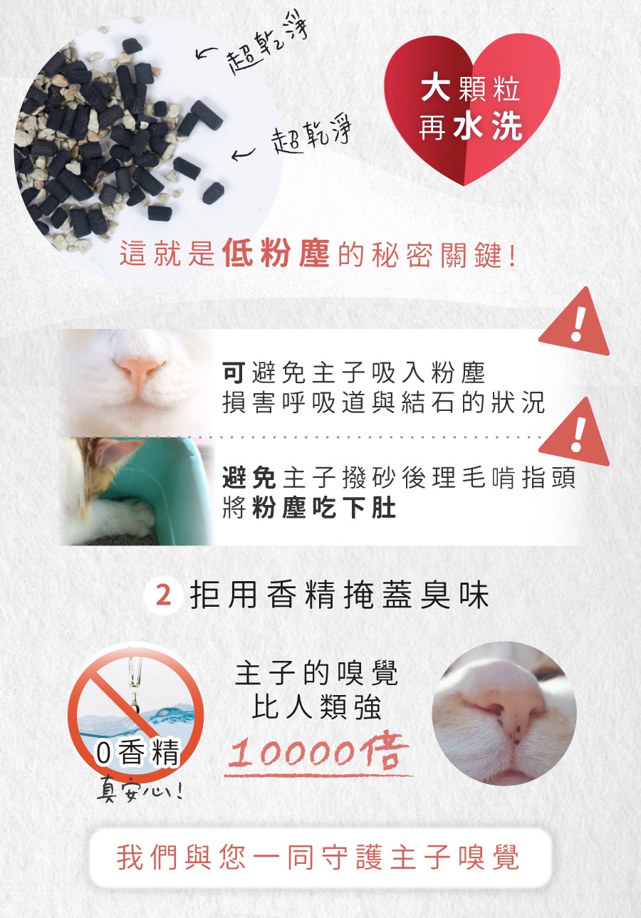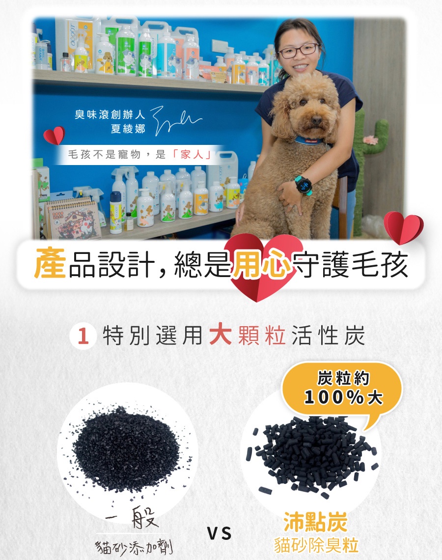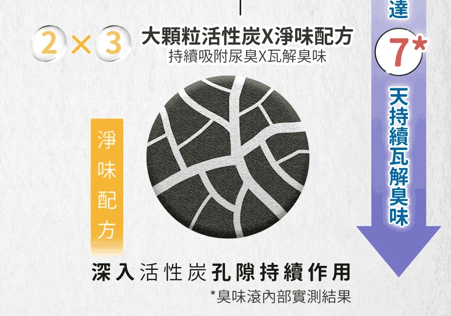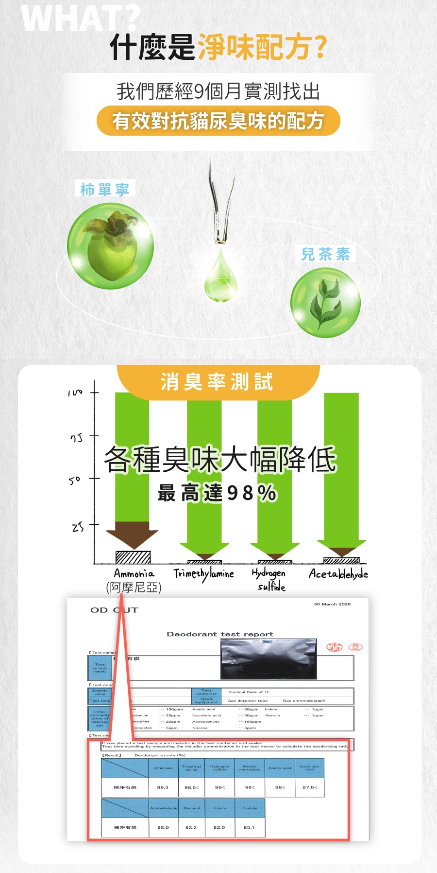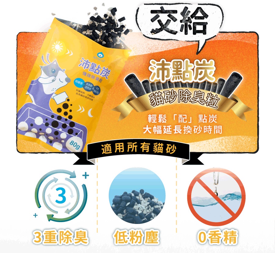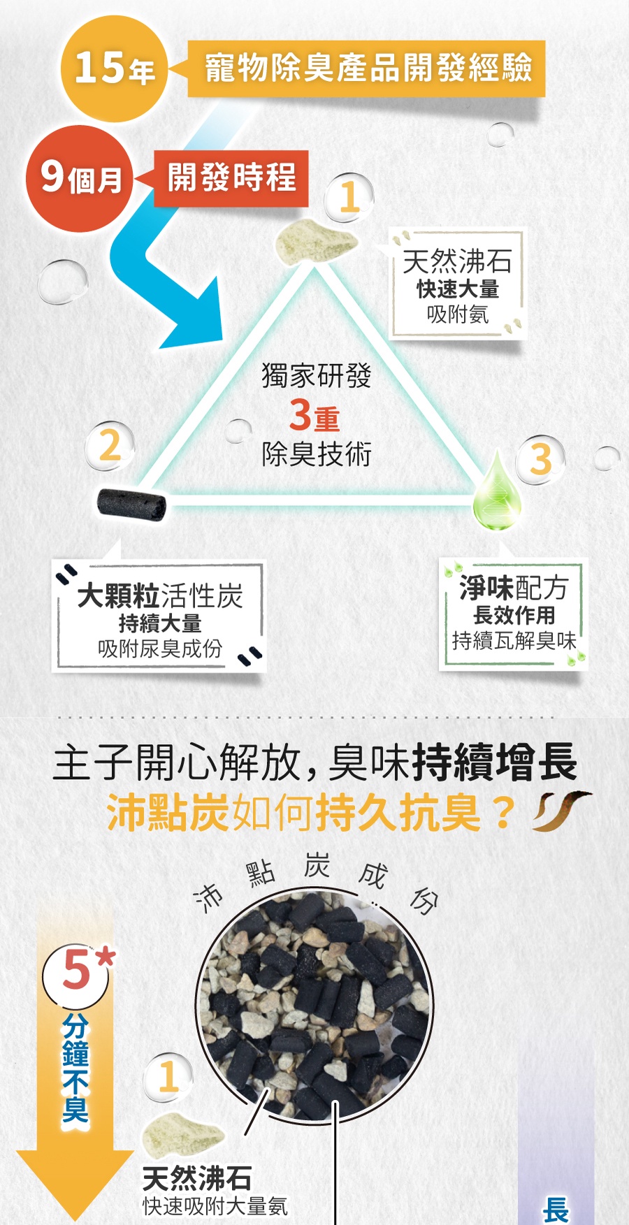 黃金除臭三角配方:天然沸石 + 大顆粒活性炭 + 淨味配方(柿單寧、兒茶素)