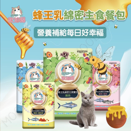 成分:水,鮪魚,鮭魚,魚油,木薯澱粉,增稠穩定劑,寡糖,大麥若葉,蜂王乳,乳酸菌,蔓越莓萃取,牛磺酸,綜合維生素(A,B1,B2,B3,B6,B7,B9,B12,C,D,E),礦物質(Ca,P,Fe,Cu,Mn,Zn,I,Se)