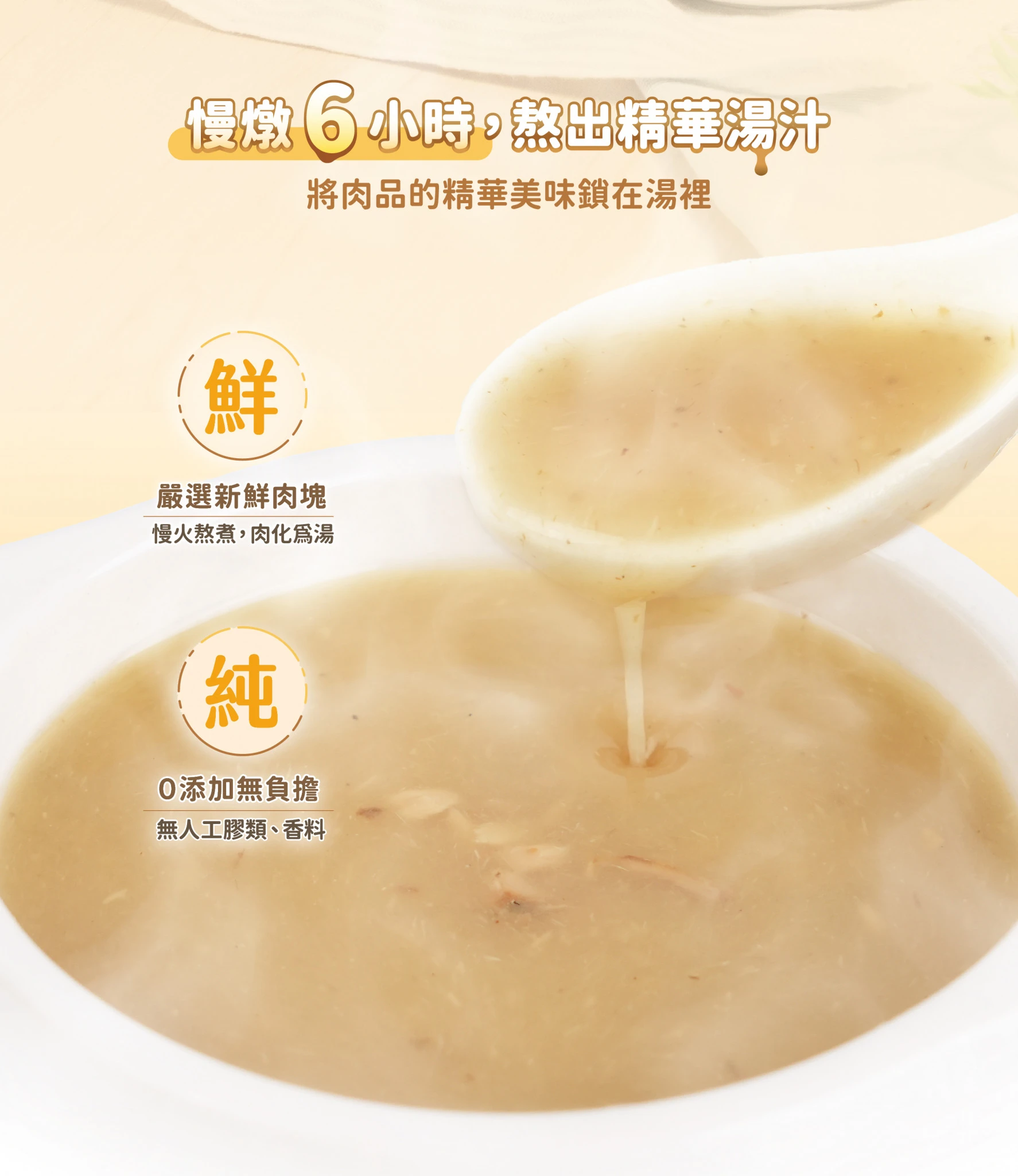 A:汪喵慢燉純湯罐使用新鮮肉塊生產並採慢火燉煮6小時,完整提煉出肉品的精華美味,因此沒有肉塊也有足夠的香氣、無經調味也好喝喔!